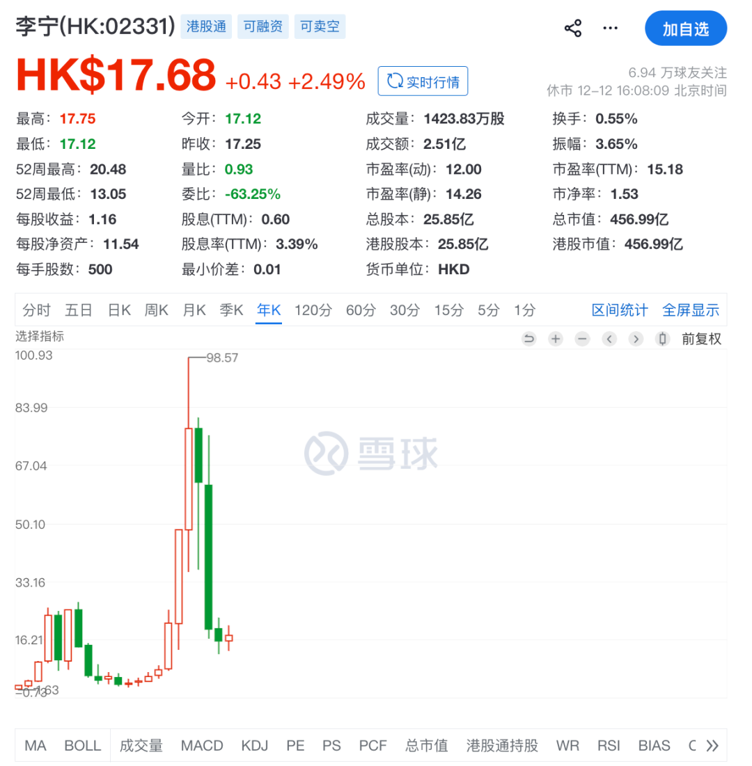 其实李宁是最早破圈的,而且李宁股价在19、20、21年三年大幅上涨,从5块钱涨到了100块钱。但是这几年下来了。