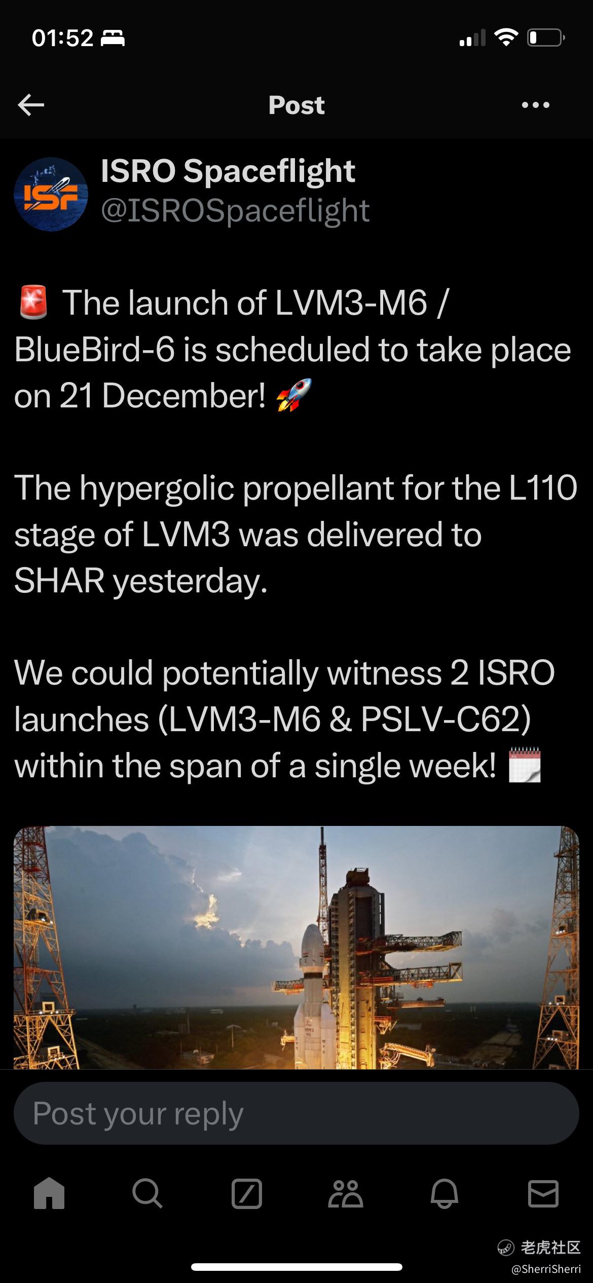 来自ISRO的消息:LVM3-M6 / BlueBird-6 的发射定于 12 月 21 日进行!