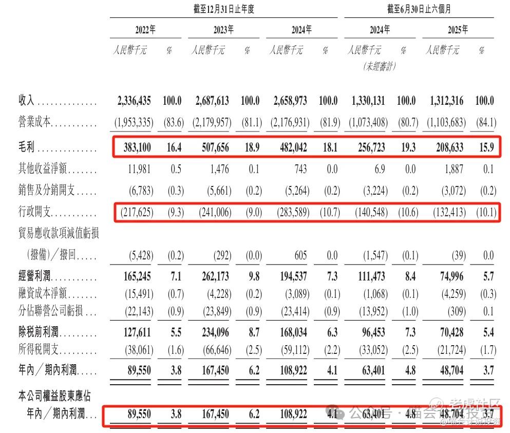 毛利益从之前几年的16%-19%,降低到了2025年上半年的16%;