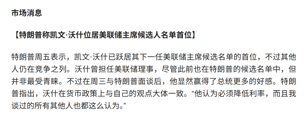 五晚美国股市发生调整,尽管股指调整十分正常,但盘中冒出的消息则耐人寻味。原本市场已经认为新任美联储主席将花落白宫首席经济顾问凯文·哈塞特的身上,但当地时间上周五,美国总统特朗普表示,他在物色鲍威尔继任者的过程中倾向于“两个凯文”(即凯文·沃什和凯文·哈塞特)。虽然哈塞特一直被视为美联储主席一职的领跑者,但特朗普表示,在周三与沃什在白宫会面45分钟后,沃什也跻身他的首选名单之列。这个消息传出导致美国股指发生了一定的调整,由此可见,沃什被市场视为相对鹰派的候选人,他的言论后续或许会被继续放大,大家需要密切关注。