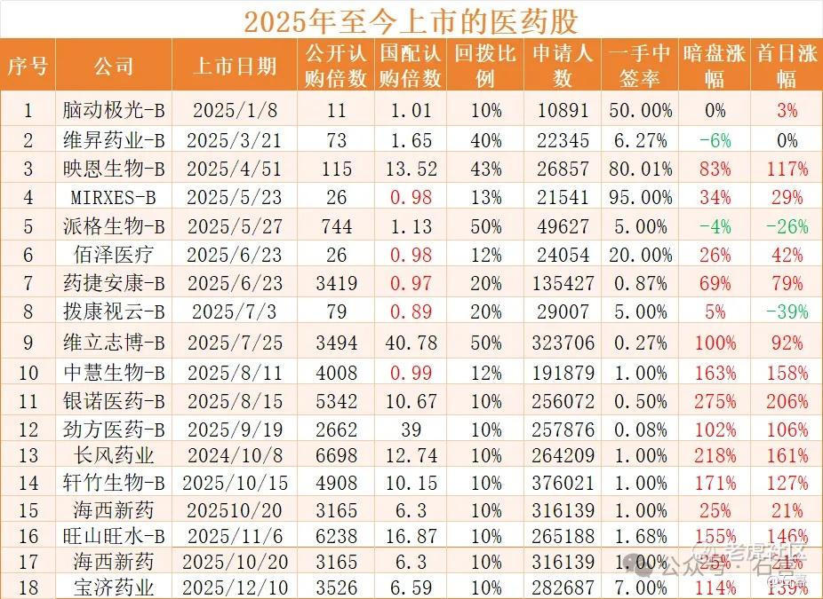 2025年上市医药股共18支,暗盘有两支破发,但幅度都不到,首日也有两只破发,幅度比较大,一支是派格生物,首日下跌26%,一支是拨康视云,首日下跌39%,不过,这个派格生物后面成了大牛,年内累计上涨316%。