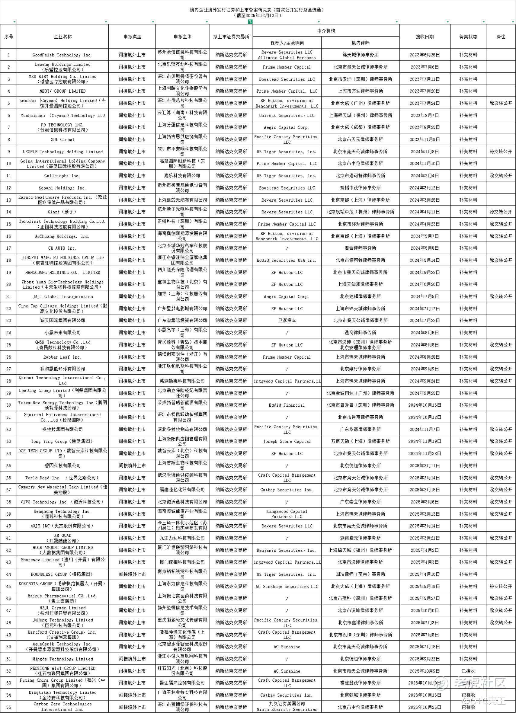 2025年12月8日-2025年12月12日,根据证监会公开披露信息,依旧是55家企业申请赴美上市。此期间14家企业获得境外发行上市备案通知书。