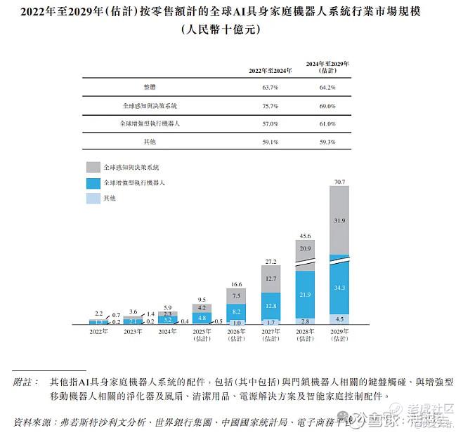 根据弗若斯特沙利文(Frost & Sullivan)的报告,按零售额计,全球AI具身家庭机器人系统行业的市场规模从2022年的人民币22亿元增长至2024年的人民币59亿元,期间复合年增长率约为63.7%。预计2029年市场规模将达到人民币707亿元,2024年至2029年的复合年增长率约为64.2%。