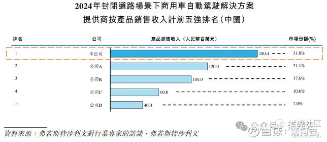 2024年,按产品销售收入计,中国封闭道路场景商用车自动驾驶解决方案的市场规模达人民币6亿元。公司实现收入约人民币1.804亿元,占市场份额31.8%,位居行业首位。