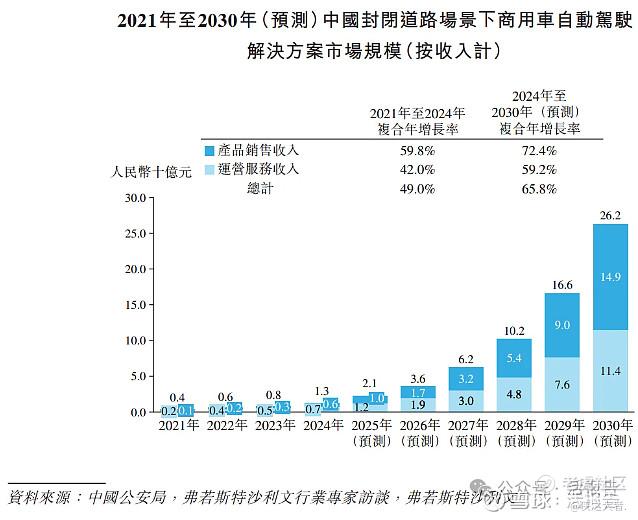 根据弗若斯特沙利文(Frost & Sullivan)的报告,在封闭道路场景中,中国商用车自动驾驶解决方案的市场规模主要包括产品销售和运营服务两个细分市场。