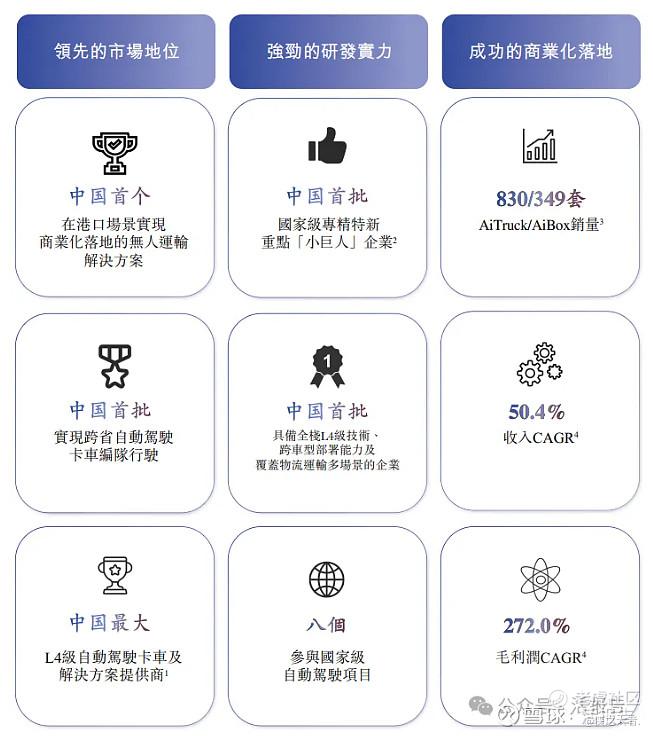根据弗若斯特沙利文的资料,公司是中国首批成功整合以下三项能力的企业之一:(i)L4级自动驾驶技术全栈自研;(ii)跨车型部署能力;(iii)在物流运输多场景实现商业化运营。