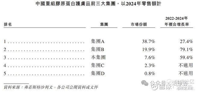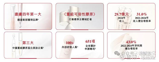 根据弗若斯特沙利文报告,以2024年零售额计,公司是重组胶原蛋白护肤品细分领域的中国第三大美妆企业。