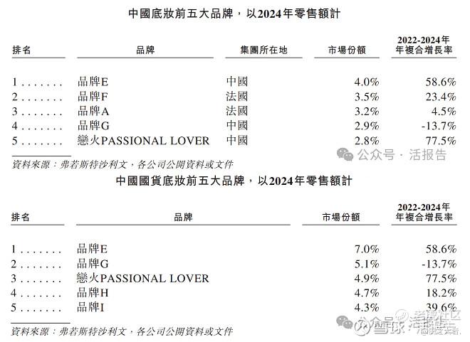 ·按2024年零售额计,恋火在中国国货底妆品牌中排名第三,在中国底妆品牌中排名第五。2022年至2024年,恋火零售额年复合增长率为77.5%,在中国前五大底妆品牌中属最高。