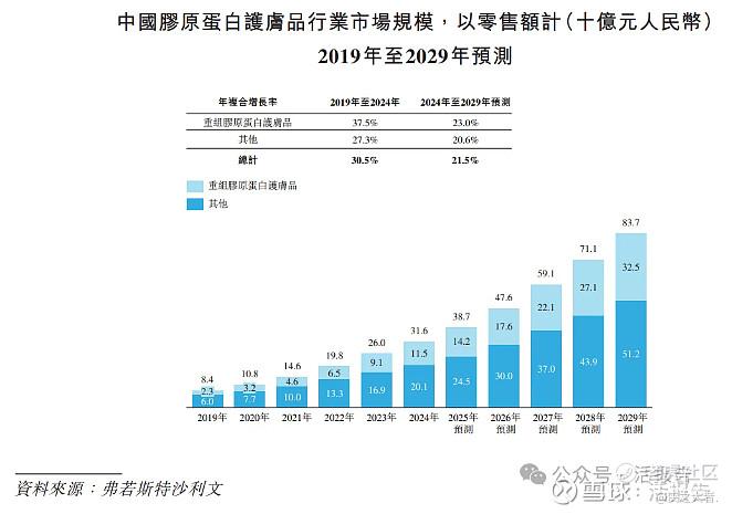 根据弗若斯特沙利文(Frost & Sullivan)的报告,按零售额计,中国胶原蛋白护肤品市场规模由2019年的人民币84亿元增长至2024年的人民币316亿元,年复合增长率为30.5%,并预计未来仍以21.5%的年复合增长率快速增长至2029年的人民币837亿元。