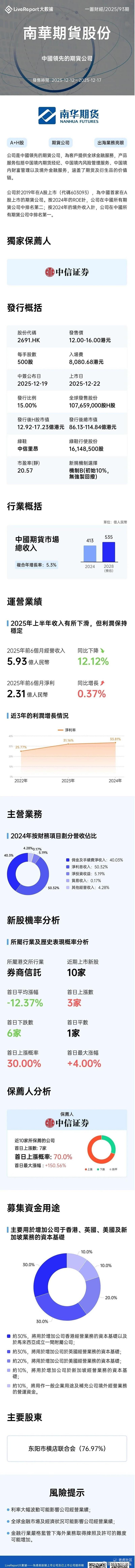 南华期货股份(2691.HK)招股日期为2025年12月12日至2025年12月17日,并预计于2025年12月22日在港交所挂牌上市。