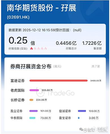 据TradeGo新股孖展数据,截至12月12日16时,南华期货股份孖展总额仅约4456万港元,孖展认购倍数约0.25倍,首日认购尚未足额。其中,富途证券、老虎证券、**证券分别放出3400万、555万、224万港元。