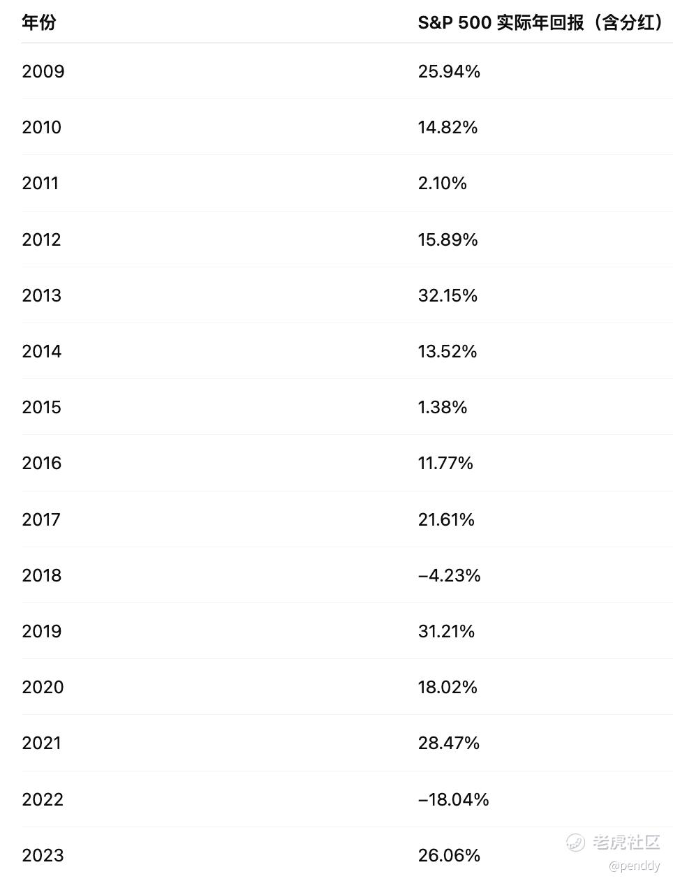 这条对于普通人购买美股来说,是一条最简单的道路,而且收益还不错,类似从 2009~2023 年的标普500 指数年化收益大概是 12.x%~13.x(含分红)。