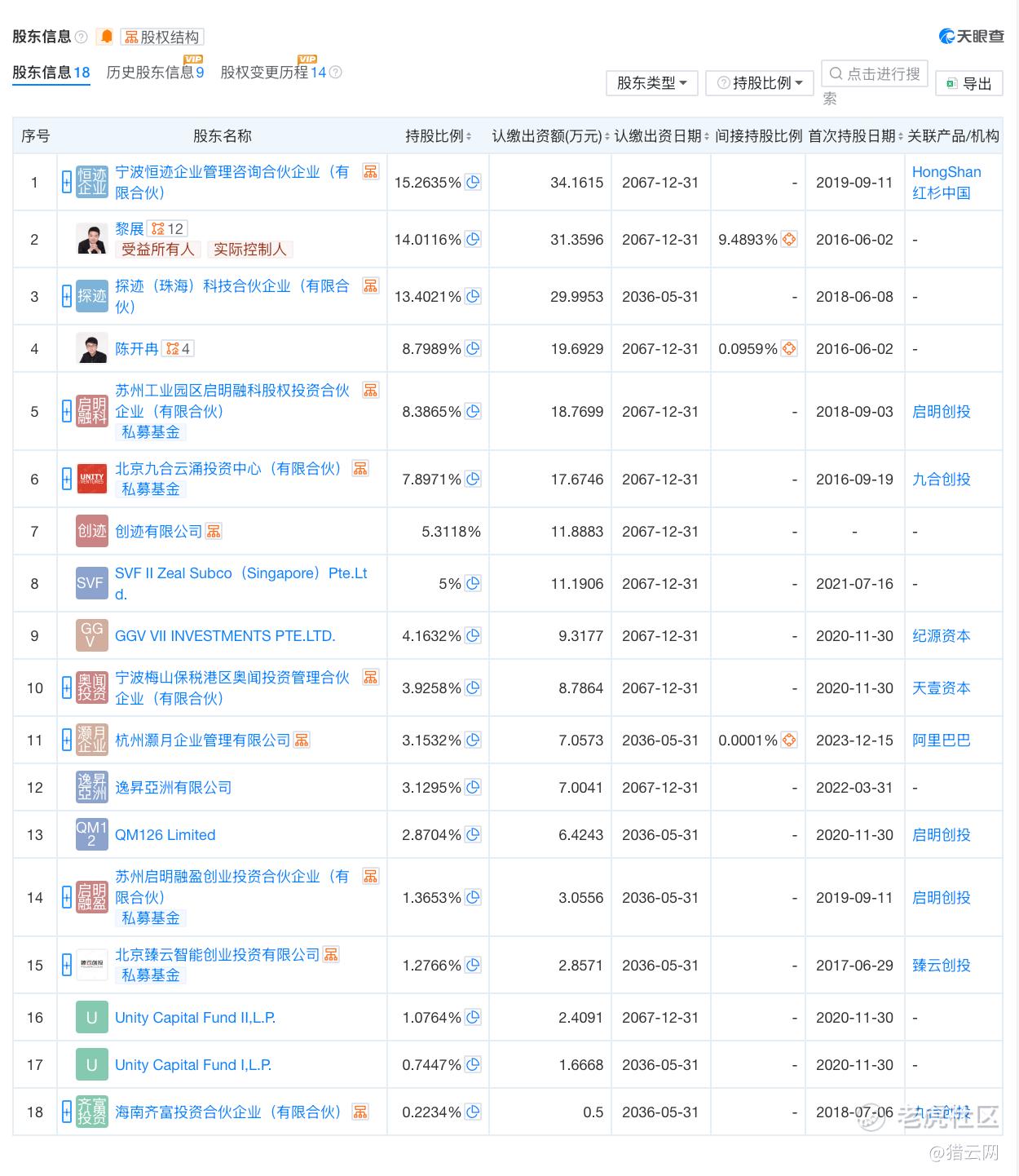 此外,红杉中国持有探迹科技15.2635%股份,系第一大外部股东;启明创投合计持股12.6222%;九合创投合计持股8.1205%;GGV纪源资本持股4.1632%;天壹资本持股3.9258%;阿里巴巴直接持股3.1532%,间接持股0.0001%。