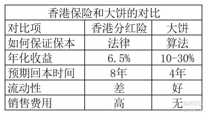 第五点,销售费用。香港分红险,销售人员的佣金加上保险公司的运营成本,这部分的费用占本金的10-15%左右。而大饼是一种公开买卖的资产,不存在销售费用。