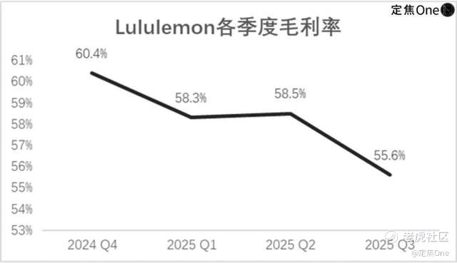 然而,过去几个季度,lululemon的毛利率水平不断走低,三季度进一步下降到了55.6%。财报将主要原因归咎于更高的关税,以及更高的折扣(markdowns)和信用卡返佣成本。