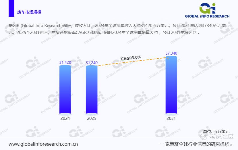 据GIR (Global Info Research)调研,按收入计,2024年全球房车收入大约31420百万美元,预计2031年达到37340百万美元,2025至2031期间,年复合增长率CAGR为3.0%。