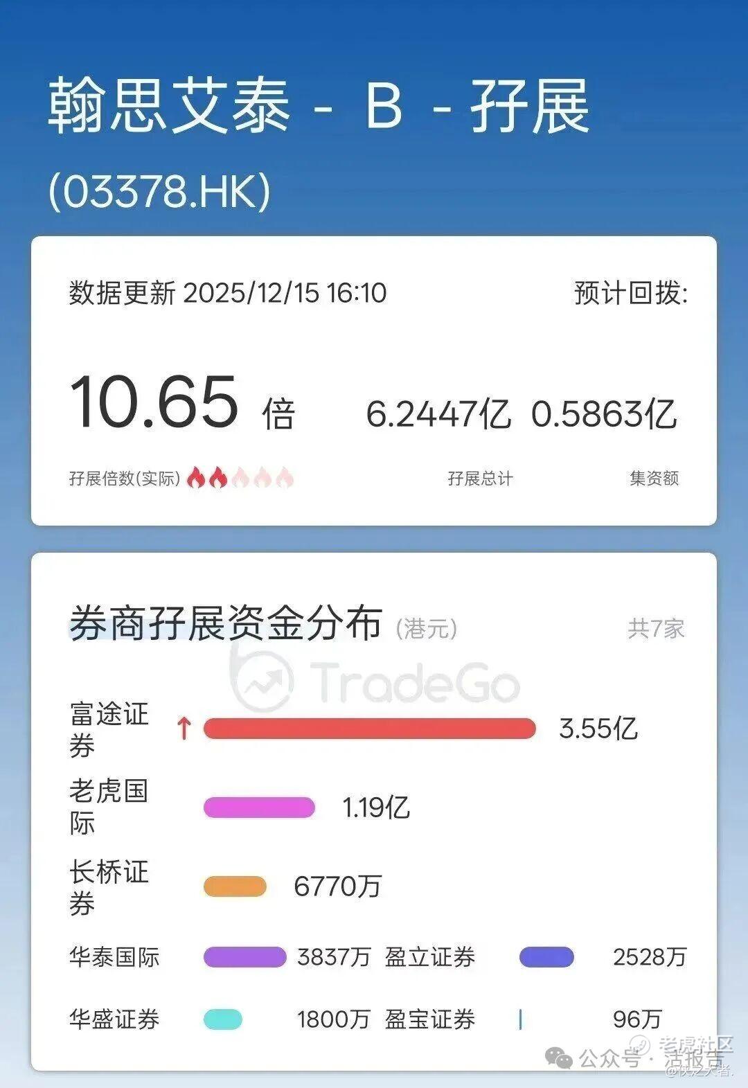 据TradeGo新股孖展数据,截至12月15日16时,翰思艾泰-B的孖展总额约6.24亿港元,孖展认购倍数约10.65倍。其中,富途证券、老虎国际、**证券分别放出3.55亿、1.19亿、0.68亿港元孖展。