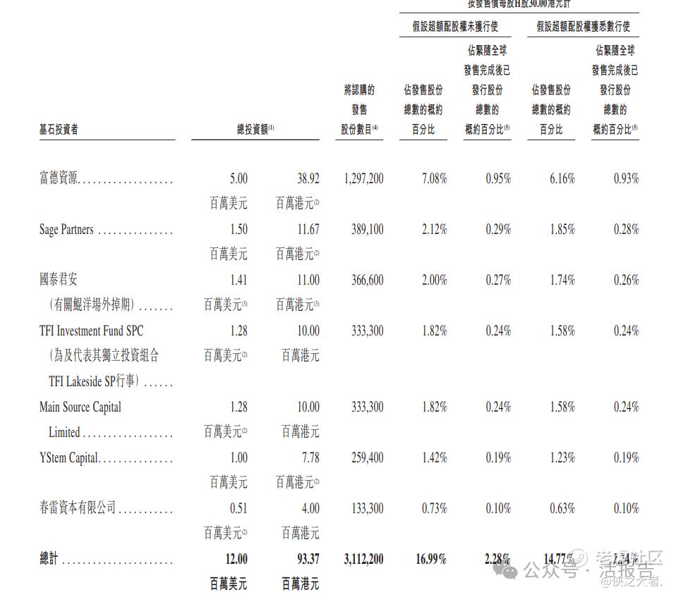 若按招股中间价30.00港元计,公司募资总额约5.5亿港元,该公司采用发行机制B,公开固定10%,无强制回拨;国配部分约占4.95亿港元,其中有7家基石投资者参与,包括富德资源、Sage Partners、鲲洋场外掉期、TFI基金(天风证券旗下)等,合计参投约9337万港元,占全球发售的16.99%。