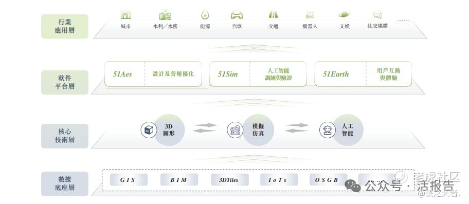 凭借着对数字孪生三大核心技术(即3D图形、仿真仿真及人工智能)的深入理解及跨领域应用,以及公司在该三项技术上的工程能力及商业化能力,公司逐步建立51WORLD数字孪生生态系统,包括四个层面:数据底座层、核心技术层、软件平台层及行业应用层。