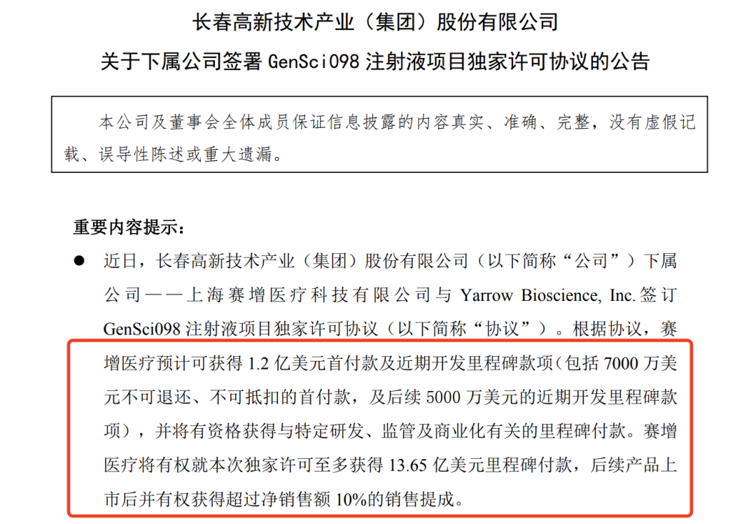 就在刚刚,曾经被誉为东北药茅的长春高新发布公告称,与美国创新药企Yarrow Bioscience签订许可协议,将旗下金赛药业/赛增医疗的GenSci098 注射液除大中华区以外的全球独家开发、生产和商业化权利授予Yarrow Bioscience,针对甲状腺相关眼病(TED)和弥漫性毒性甲状腺肿(GD)等适应症的研究开发和商业化。