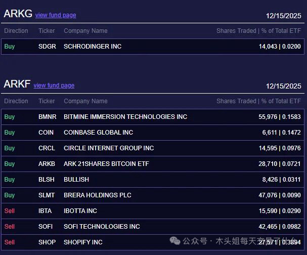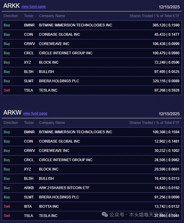 木头姐今天买入1100万美元CRCL 1800万美元BMNR 卖出6000万美元特斯拉