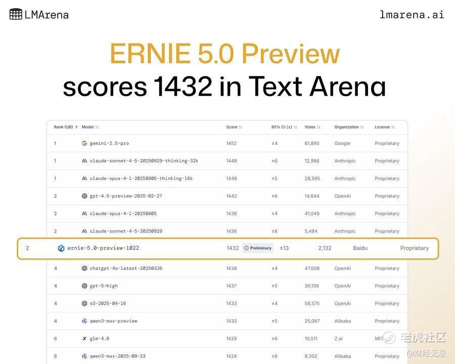 文心大模型5.0有2.4万亿参数,文心5.0 Preview在全球权威评测LMArena上排名并列第二,中国第一。