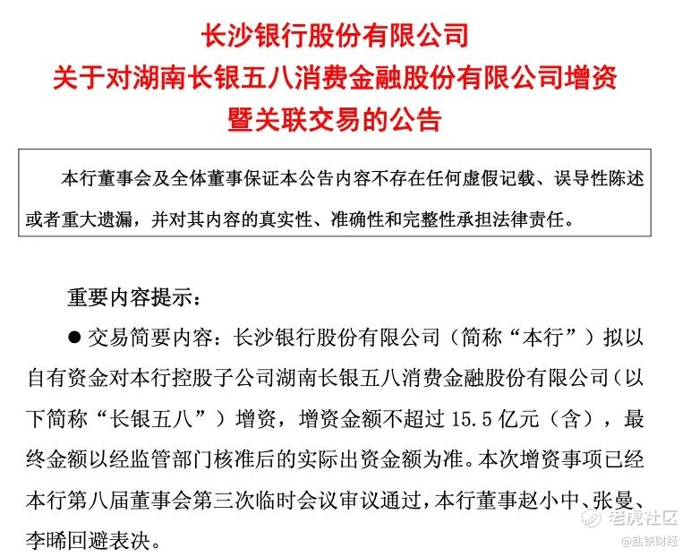 11月15日,长沙银行发布公告称,该行拟以自有资金对该行控股子公司湖南长银五八消费金融股份有限公司(以下称“长银五八”)增资,增资金额不超过15.5亿元(含),最终金额以经监管部门核准后的实际出资金额为准。