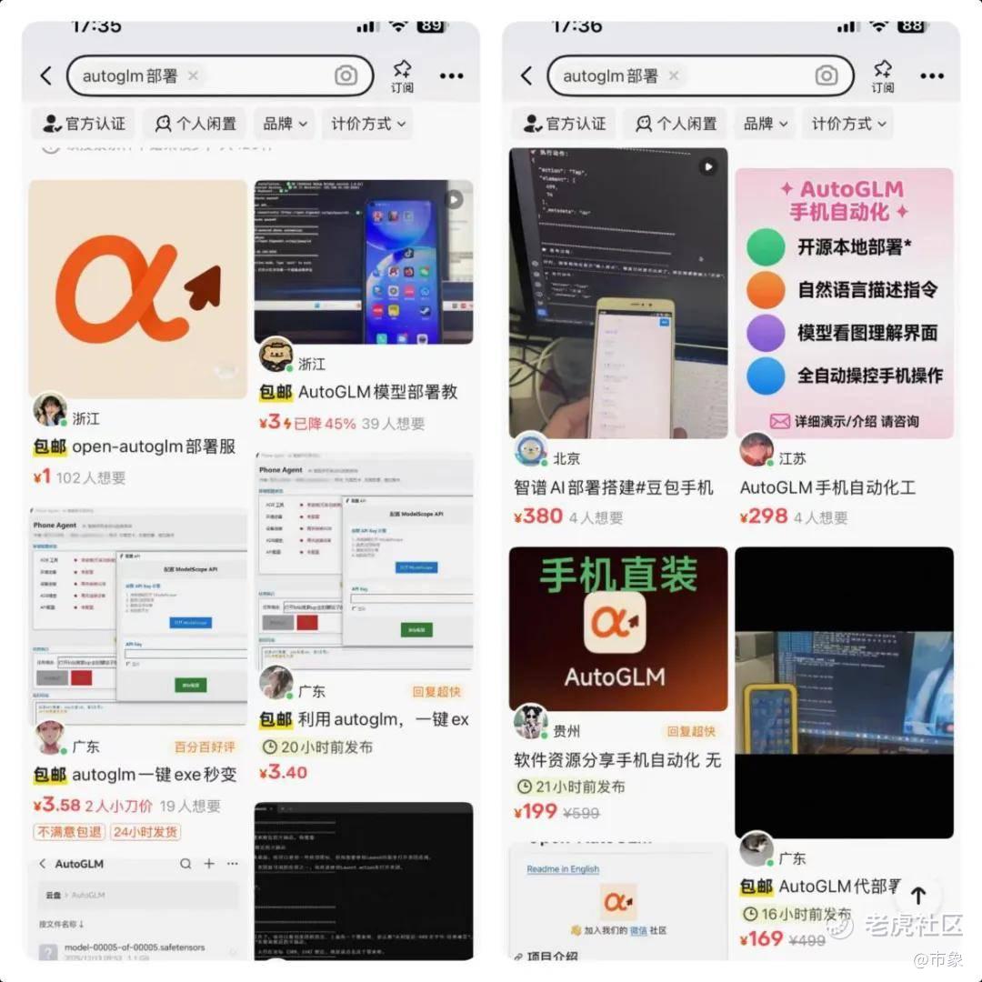 「市象」从闲鱼平台搜索“Autoglm部署”发现,有不少卖家都打出“智谱ai手机部署”、“auto手机自动化本地部署”的招牌,从最低1元到最高近500元的价格。相比在闲鱼溢价1万2的豆包手机,可谓性价比十足。