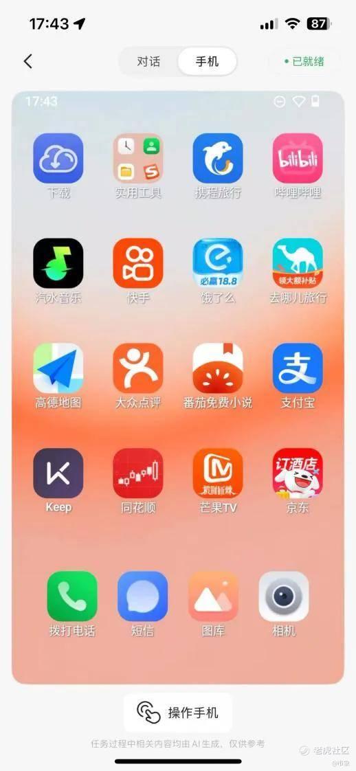 从应用商城下载这款AutoGLM app体验发现,AutoGLM是在app中模拟了一个名为“智能体手机”的云端手机操控界面,内置30多款常用app应用,用户可以打开云手机桌面上的app登录自己的社交账号,通过发送指令实现程序的自动化运行。