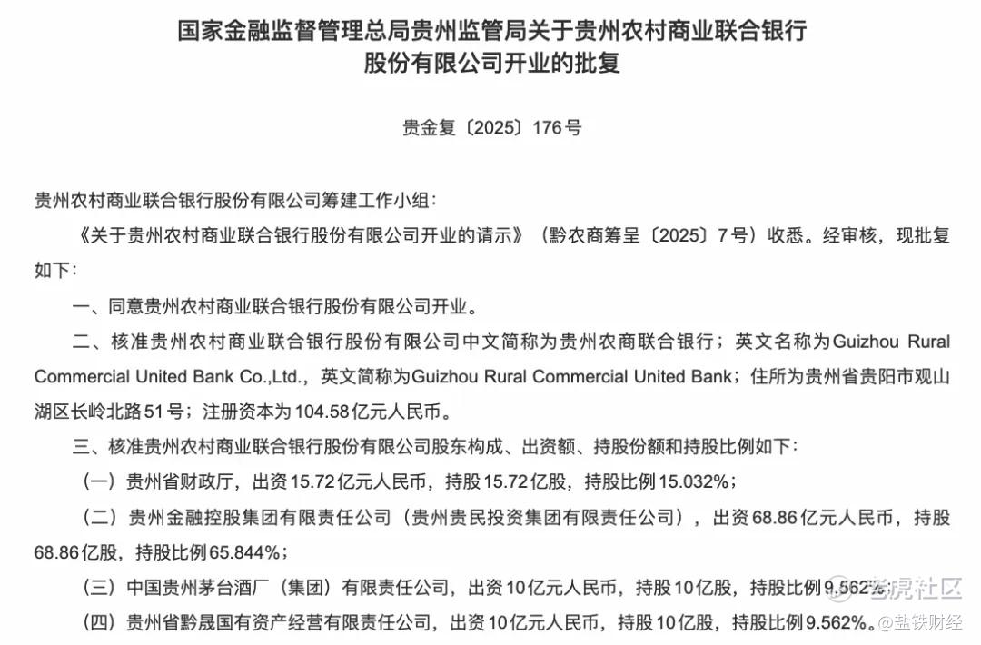 12月15日,国家金融监督管理总局贵州监管局发布批复,准予贵州农村商业联合银行股份有限公司(下称“贵州农商联合银行”)开业。根据批复,贵州农商联合银行注册资本为104.58亿元。