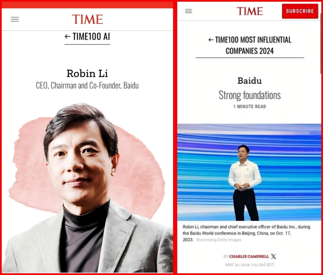 持续的投入使百度获得了国际认可。2018年登上《时代》周刊封面。2023年9月,李彦宏入选《时代》首期“全球百大AI人物”榜单,与马斯克、黄仁勋、奥特曼等共同被评为“全球AI领袖”。《时代》肯定他是“中国最杰出的未来主义者,长期投身于AI发展的浪潮”。
