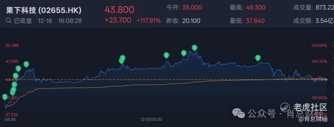 新股果下科技首日收涨117.91%,43.8港币收盘。这个股最早从12月3号还没招股时候,我就开始给圈子里一些老资历的合格投资者单独安排国配了,是我们明确要重点搞的新股。