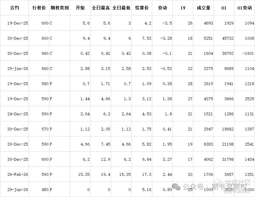 (1)腾讯:12月最大持仓范围500-660,窝轮牛熊街货分布570-635,今收596.5,下跌1.08%,跌时隔3个多月,首次跌破600大关。期权盘路变化超过1000张的仓位如下,总的来看,继续下跌的概率在加大。