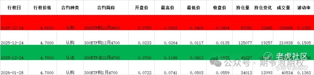 (1)沪深300ETF(沪)期权:12月最大持仓范围4600-4700,今收4.620,下跌1.01%。期权12月主力合约,认购增仓集中在4500-4700,合计4.3W张,其他行权价全是减仓,集中在4800-5500,合计1.9W张;认沽全部都是减仓,集中在4300-4900,合计4.0W涨。市场比较悲观,变化超过W张的仓位如下,红色是增仓较大,绿色时间仓较大的。