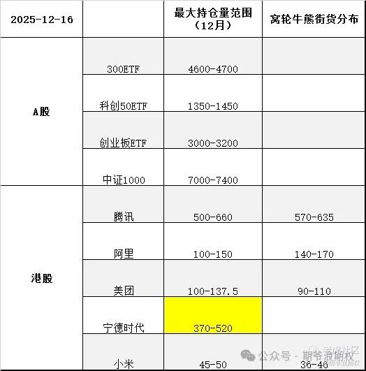 不管行情怎么样,期权复盘找方向。下图是今天大A的3个ETF和中证1000,以及港股的腾讯、阿里、美团、宁德和小米的最大持仓量范围以及窝轮牛熊分布范围,也就是12月的期权筹码分布,黄色的表示跟上个交易日有变动。