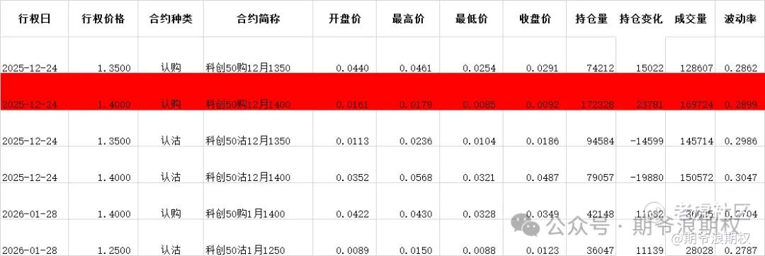 (2)科创50ETF:12月最大持仓范围1350-1450,今收1.361,下跌2.02%。期权12月主力合约,认购是增仓集中在1300-1400,合计,4.1W张,其他行权价几乎都是减仓,集中在1450-1650,合计2.1W张;认沽以减仓为主,集中在1300-1550,合计5.3W张。变化超过1W张的仓位如下,红色是增仓较大的。