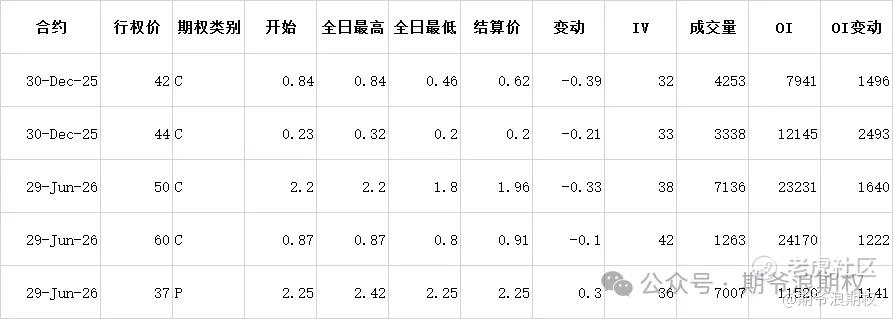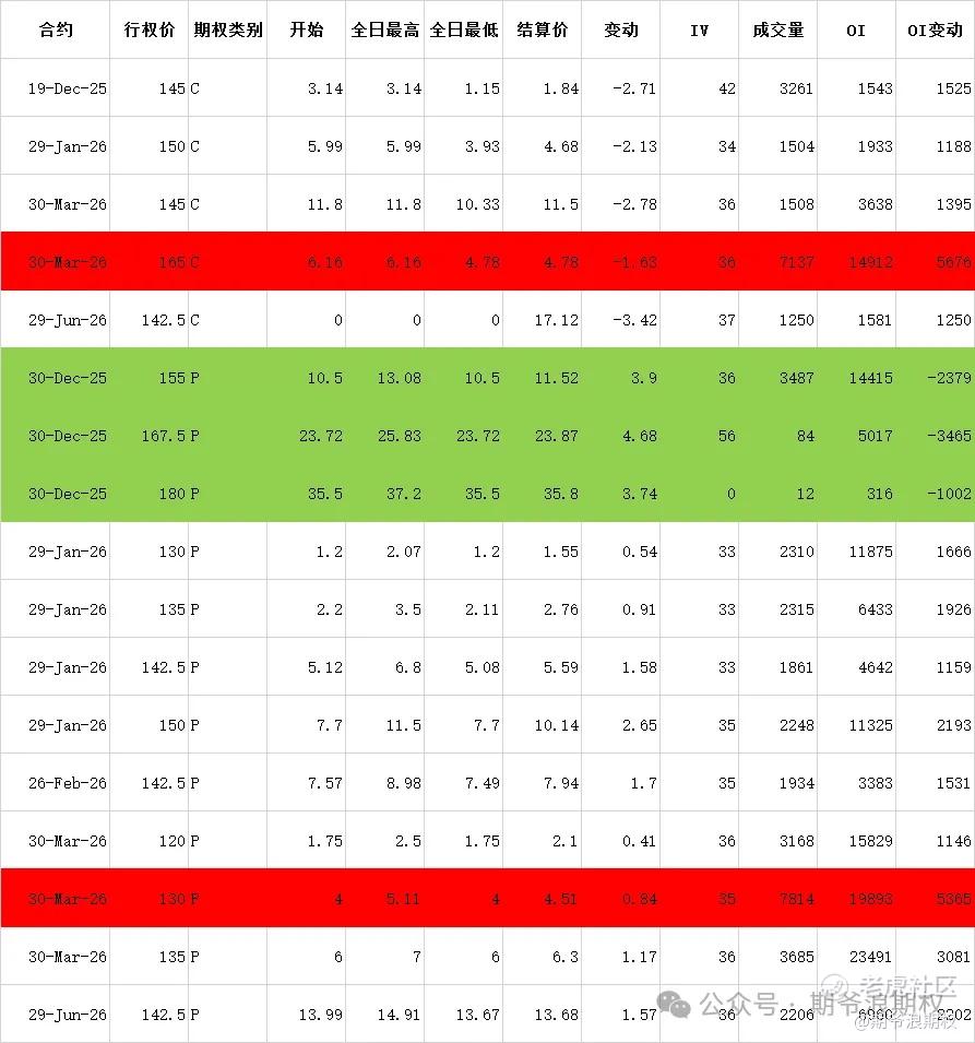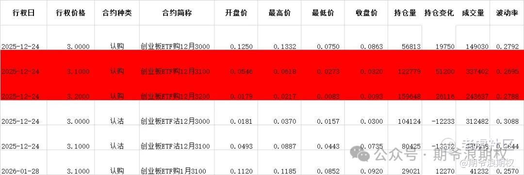 (3)创业板ETF期权:12月最大持仓范围3000-3200,今收3.060,下跌1.92%。期权12月合约,认购以增仓为主,集中在2900-3300,合计10.6W张;认沽有增有减,增仓集中在1700-1900,合计1.2W张,减仓集中在2950-3300,合计3.0W张。变化超过1W张的仓位如下,红色是增仓较大的。