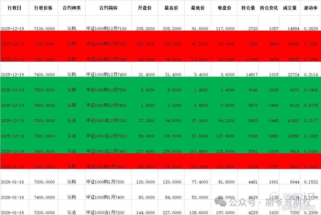 (4)中证1000期权:12月最大持仓范围7000-7400,今收7181.62,下跌1.74%。期权12月主力合约,认购增仓集中在7100-7400,合计8800张,其他行权价几乎全是减仓,集中在7500-8000,合计7400张;认沽几乎全部都是减仓,集中在7000-7500,合计9200张。变化超过1000张的仓位如下,红色是增仓较大的,绿色是减仓较大的。