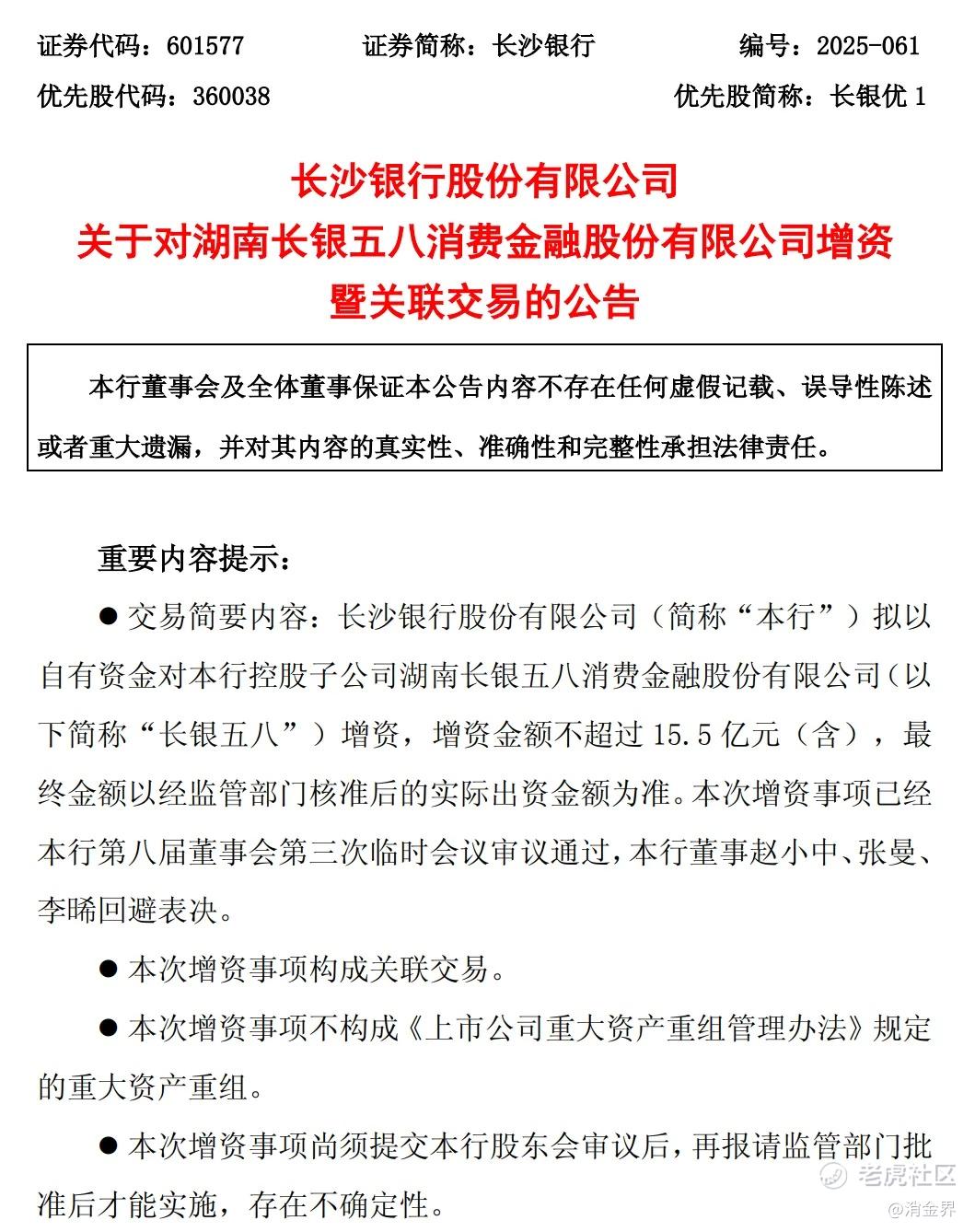 12月16日,长沙银行发布关于对湖南长银五八消费金融增资暨关联交易的公告,长沙银行拟以自有资金对控股子公司湖南长银五八消费金融股份增资,增资金额不超过15.5亿元(含),最终金额以经监管部门核准后的实际出资金额为准。