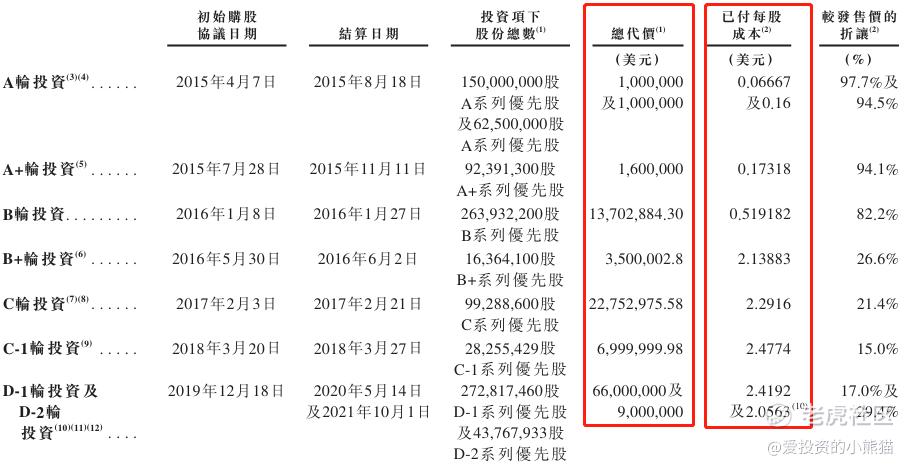 轻松健康的融资进程主要集中在2015年至2019年,先后完成A轮、A+轮、B轮、B+轮、C轮、C-1轮及D-1/D-2轮融资,融资规模呈现显著增长态势:早期A轮总代价仅百万美元级,到D轮时总代价合计达7500万美元,反映资本市场对其发展潜力的认可度持续提升。从每股成本来看,A轮每股成本低至0.06667美元,后续逐步攀升,B+轮后突破2美元,C-1轮达2.4774美元的阶段性高点,D轮虽略有回落但仍维持在2美元以上,体现企业股权价值随发展不断走高。而发行价折让比例则从A/A+轮的超90%大幅收窄,C-1轮仅15%,D轮虽略有回升但仍远低于早期,说明企业后期融资的议价能力显著增强,早期投资者能获得的价格优惠远高于后期轮次。
