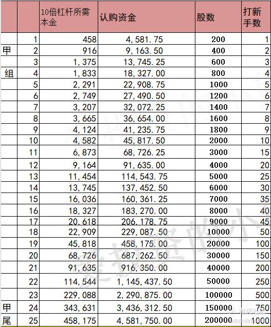 甲组的各档融资所需要的本金还有融资金额对应如下表: