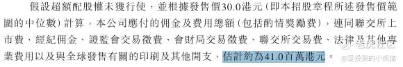 然后这个票招股书上按发售价的中位数30.00港元计算,公开的上市所有开支总额约为4100万港元,募资额约5.50亿港元,占比约7.46%,开支相比募资额算是比较少了。