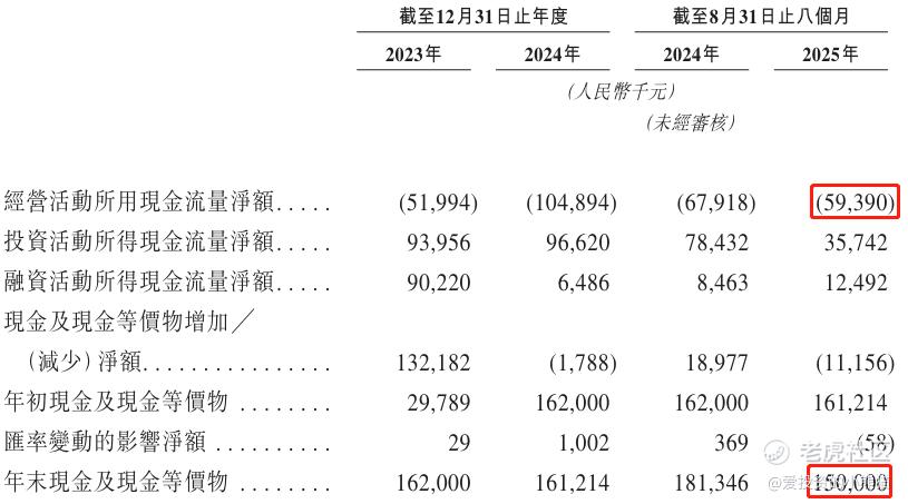 截至2025年8月31日,公司账上现金有人民币1.50亿元,经营活动现金流为-0.59亿元。