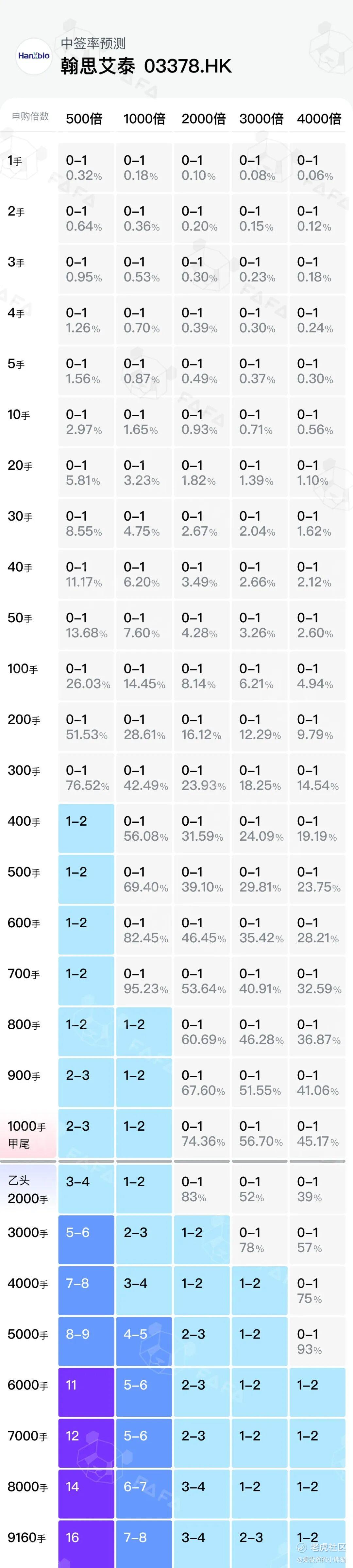 这个票发行市值38.14亿-43.59亿港元,H股市值同样也是38.14亿-43.59亿港元,募资总额5.13亿-5.86亿港元,如果按发售价上限价离港股通90-100亿的门槛差不多1倍多点,而且是按机制B发行,大概率是一票难求了!现在港股通按照100亿上限的情况下,100-43.59=56.41,56.41/43.59=1.29,那如果按照目前港股通94亿来算的话,94-43.59=50.41,50.41/43.59=116%,这个预期是