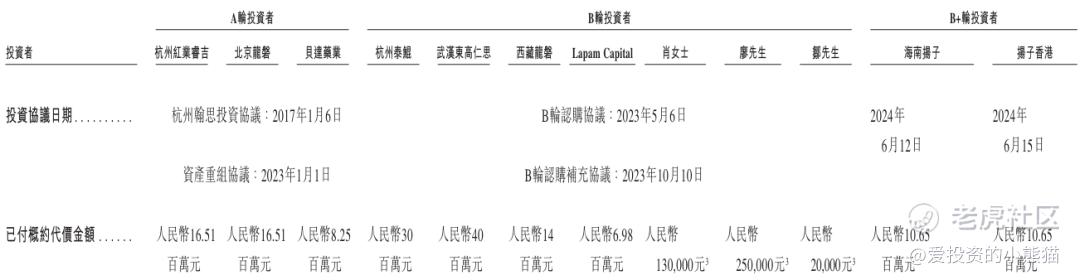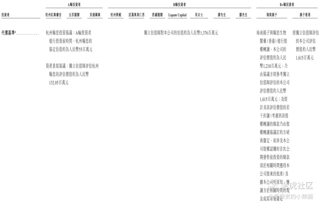 翰思艾泰IPO前完成A、B、B+三轮融资,资金端合计已付代价约1.54亿元人民币:A轮引入杭州红栗吉吉、北京龙磐等机构,投资方合计支付约7127万元,每股投资成本1.28元;B轮由武汉东高仁思、Lapam Capital及肖女士等个人投资者参与,合计出资约6138万元,每股成本升至11.71元;B+轮则获海南扬子、扬子香港注资共2130万元,二者每股成本分别为10.4元、13.65元。从估值变化看,公司A轮投资前估值仅5500万元,B轮估值达13.76亿元,B+轮参考估值进一步增至16.15亿元,两年内估值增长超29倍,股权价值提升显著。