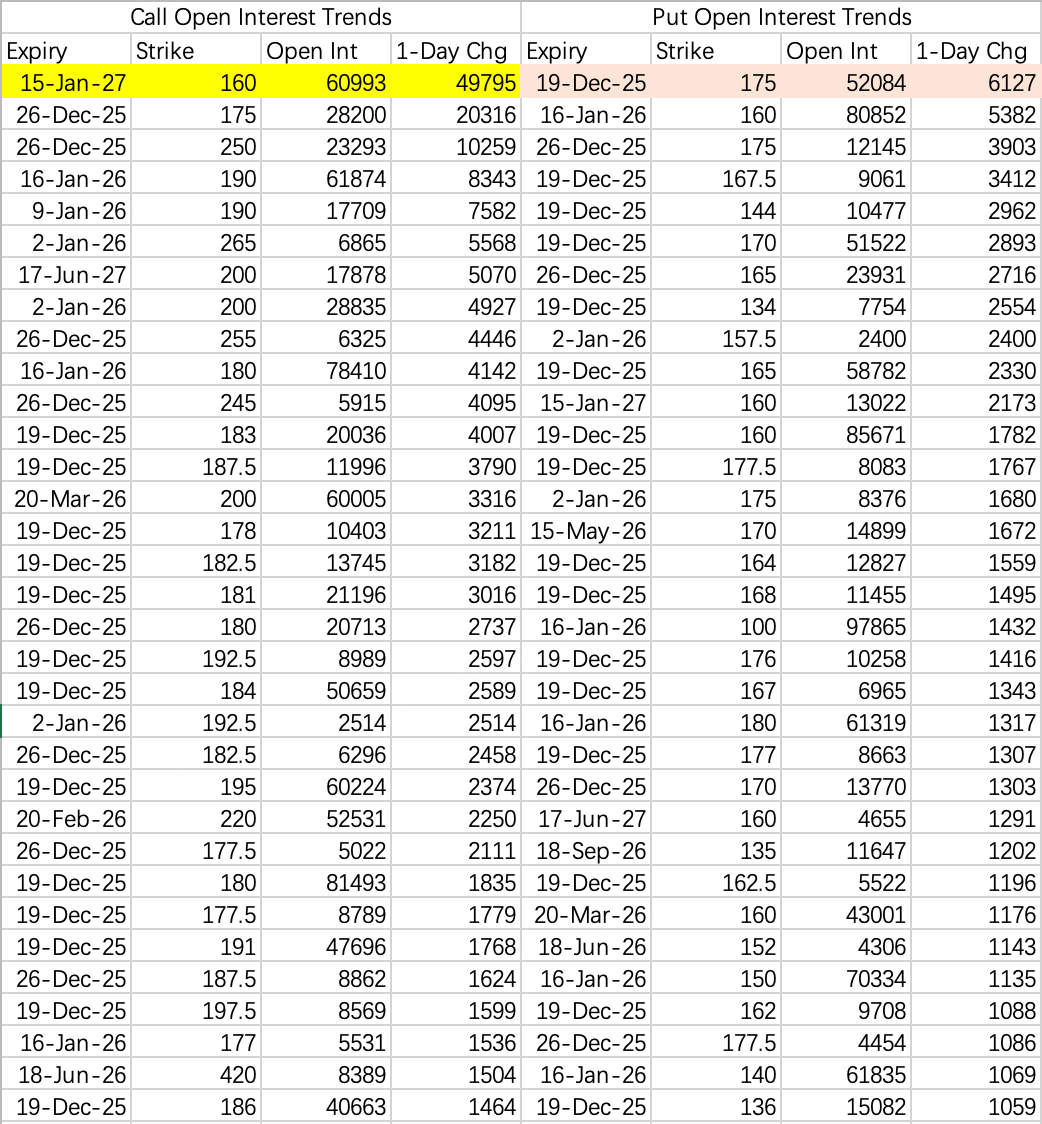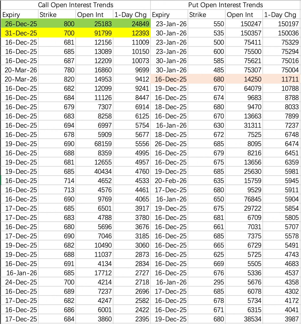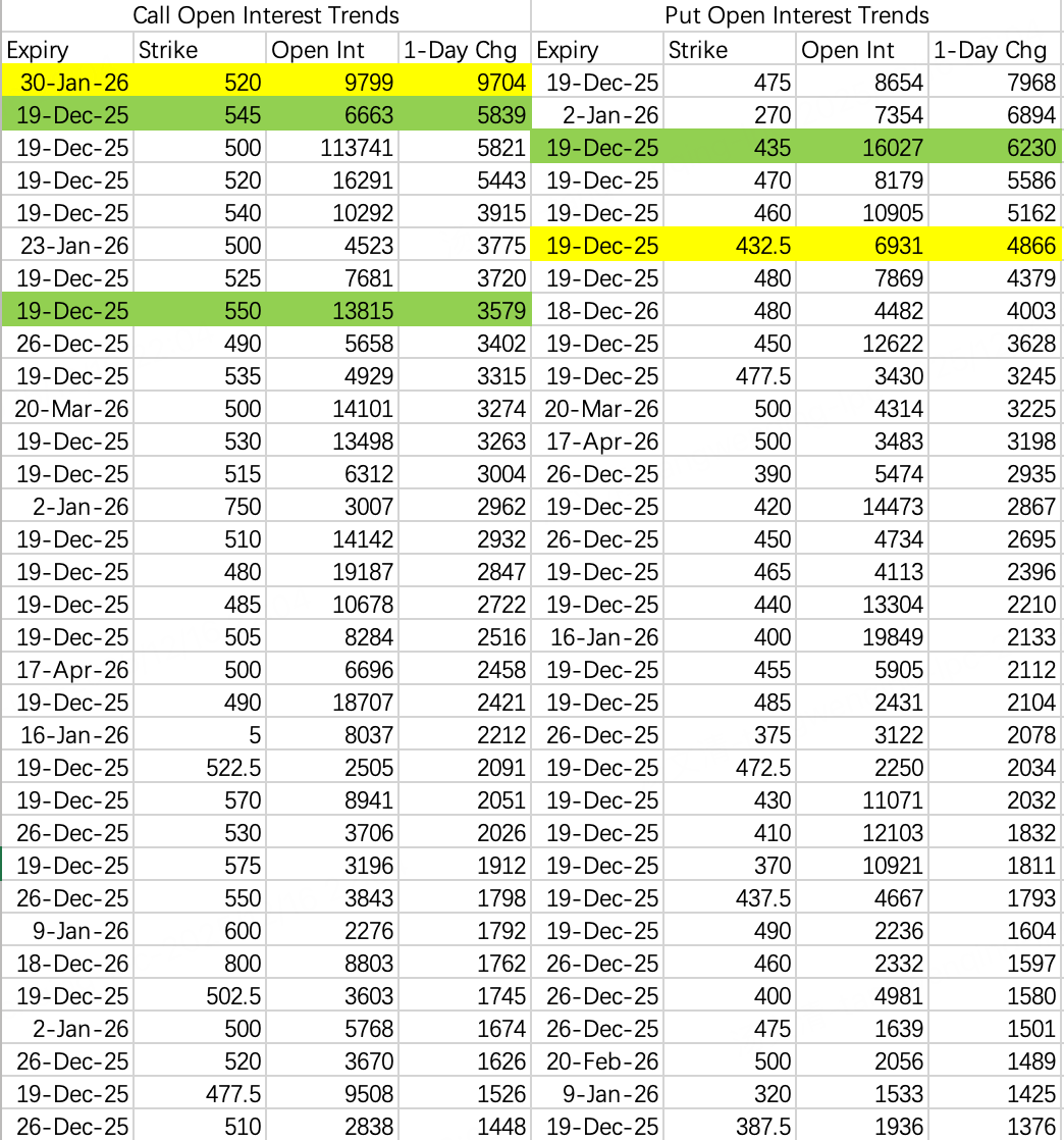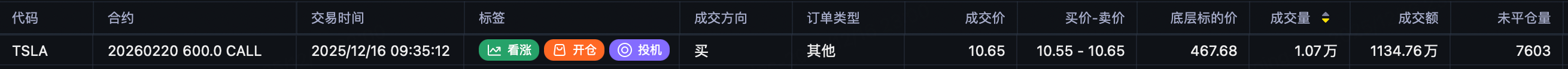 虽然不知道有什么利好消息,不过从特斯拉的看涨期权开仓来看,中期call 520$TSLA 20260130 520.0 CALL$ 开仓9704手,开仓方向多为买入。