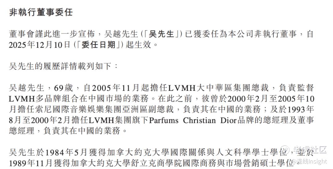 “LVMH大中华区总裁加入泡泡玛特董事会”,12月10日,泡泡玛特发布的一则公告引起外界高度关注,公告显示,吴越先生已获委任为公司非执行董事,自2025年12月10日起生效,期限三年。