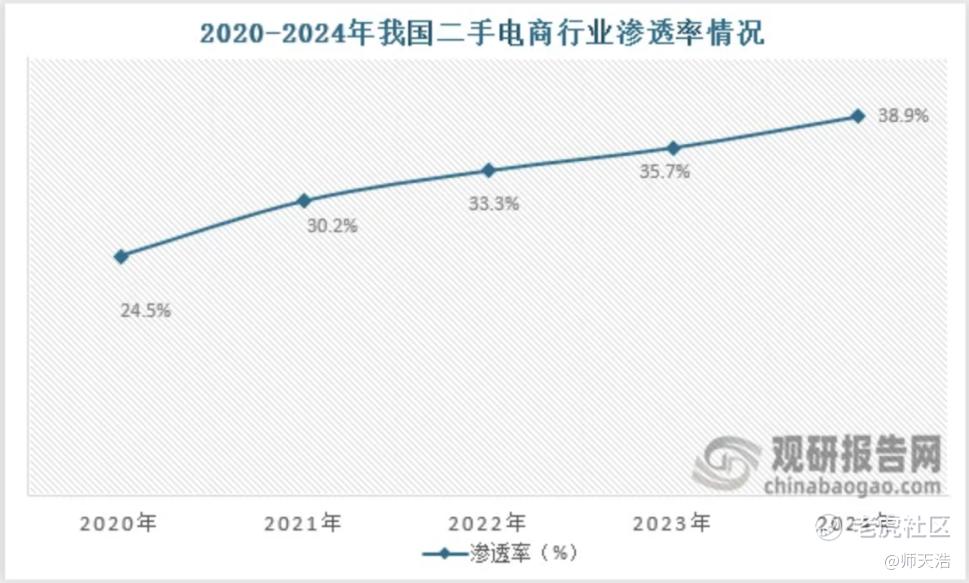 二手电商的渗透率也在不断提升,从渗透率来看,2020年到2024年我国二手电商行业渗透率从24.5%增长到了38.9%。