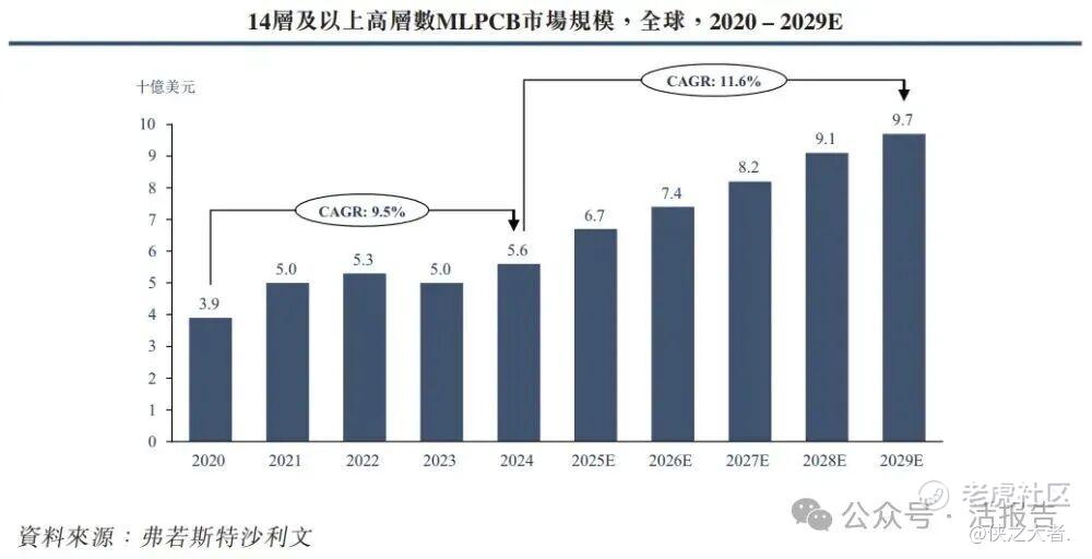根据弗若斯特沙利文(Frost & Sullivan)的报告,按销售收入计,14层及以上高层数MLPCB的全球市场规模已由2020年的39亿美元增长至2024年的56亿美元,预计于2029年达到97亿美元。