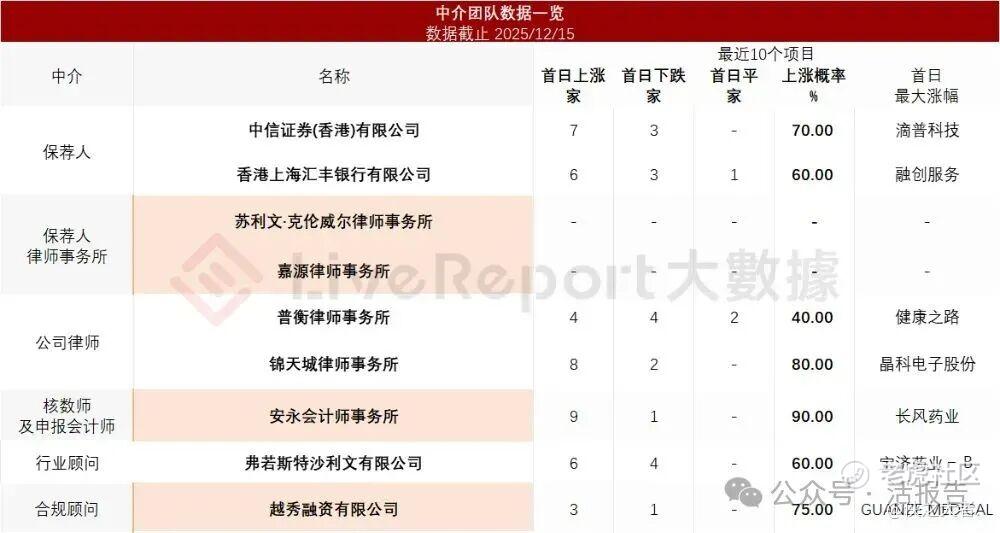 据**大数据统计,广合科技中介团队共计9家,其中保荐人2家,近10家保荐项目数据表现中规中矩;公司律师共计2家,综合项目数据表现普通。整体而言中介团队历史数据表现缺乏亮点。